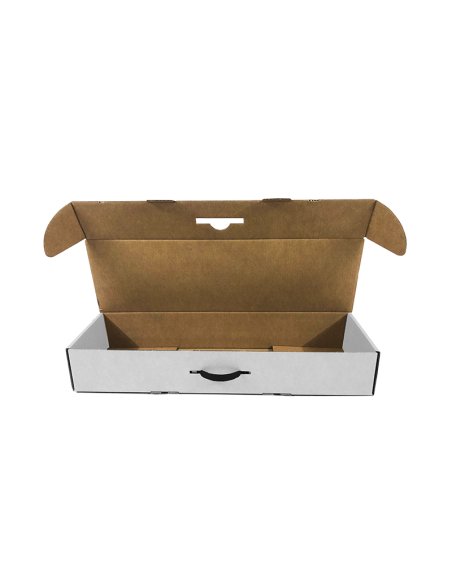 Caja blanca para jamón, paletilla, paleta y embutidos, estilo estuche automontable con asa incluida en color negro.
