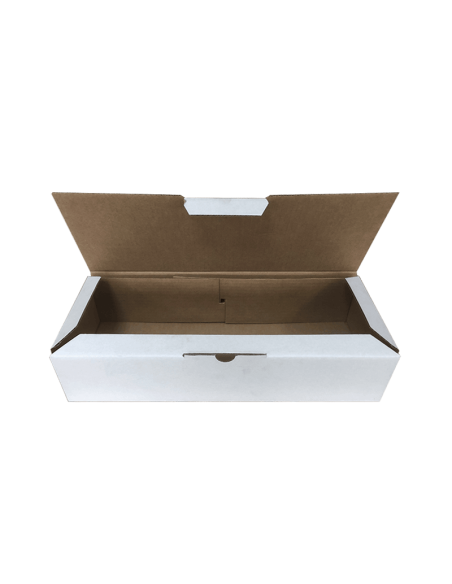 Cajas automontables de cartón ondulado blanco canal simple B de dimensiones interiores 415x162x92cm (exteriores 42x17x10cm) perfectas para pequeños envíos de tu tienda online, ecommerce o física. Son fáciles de montar y no requieren cinta adhesiva, además que tener mucha consistencia para aguantar bien la manipulación en el envío. Se sirven en plano y se envían en una caja a su medida..