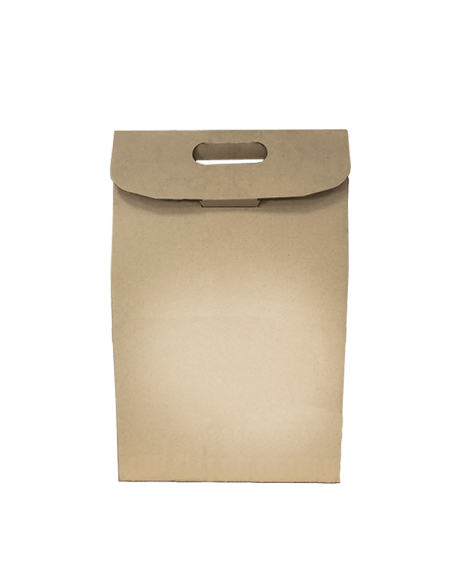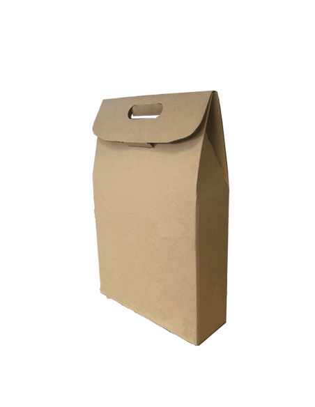 Cajas marrones personalizables de cartón con asa para 3 botellas de vino. Perfecta como envoltorio de regalo y para la entrega de merchandising o cualquier otro tipo de detalle en eventos, cumpleaños y celebraciones de toda clase.